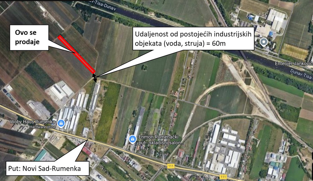 Zemljište pored puta Novi Sad – Rumenka, 550m od glavnog puta (videti mapu).